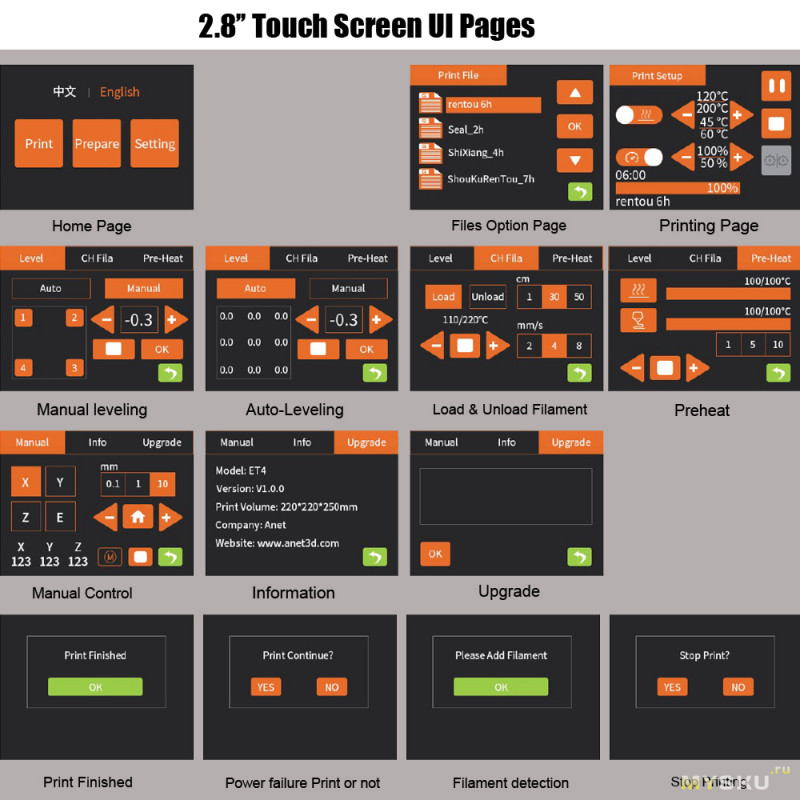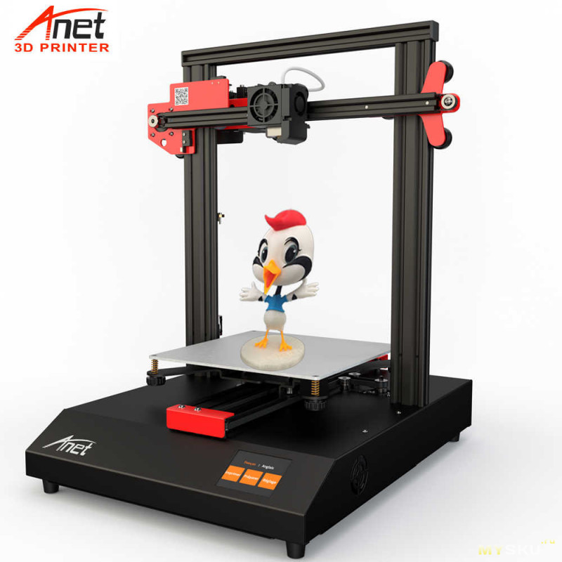 Новая модель 3д принтера от Anet. Данный принтер уже изначально имеет датчики авто уровня и окончания филамента, функцию возобновления печати после обрыва питания, закаленное стекло на столе, ЦВЕТНОЙ, сенсорный дисплей, а также симпатичный внешний вид. В общем усовершенсвованный ЭНДЕР — 3 !!!